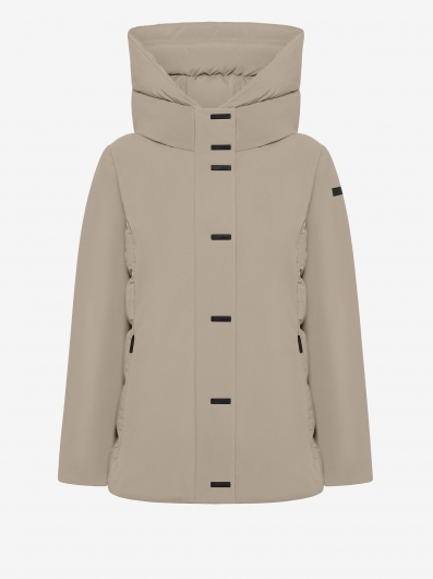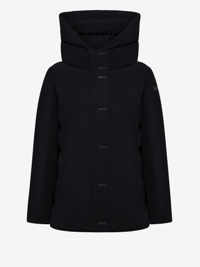 Un capo perfetto per il suo mix di stile minimalista e funzionalità. Sul davanti, il finish super opaco del tessuto a membrana impermeabile e traspirante, con esterno nell'esclusivo SURFLEX®, gioca a contrasto con i fianchi e il retro caratterizzati dai canali tubici. Privi di impunture e di interruzioni della texture, contengono la morbida e calda imbottitura in piuma d'anatra 90/10, di grande leggerezza e comfort. Il cappuccio avvolgente e protettivo, la patta con bottoni satinati a barretta che nasconde la chiusura frontale a zip termonastrata e le tasche a zip invisibili accentuano l'estetica nitida ed essenziale della creazione. Lo stile e la dinamicità del design sono completati dall'inconfondibile nota del logo a microiniezione nero sulla manica sinistra.