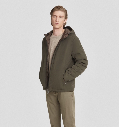 Piumino corto reversibile imbottito in vera piuma 800 fill power, realizzato con esterno in tessuto liscio poly taslan trattato water repellent e interno trapuntato in nylon ciré opaco.
