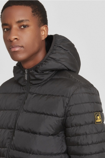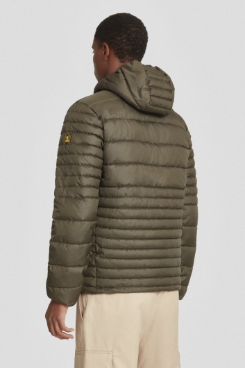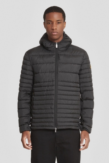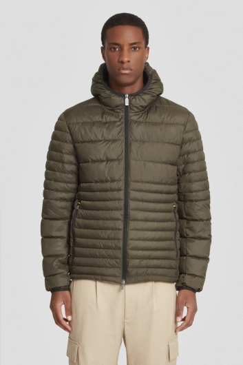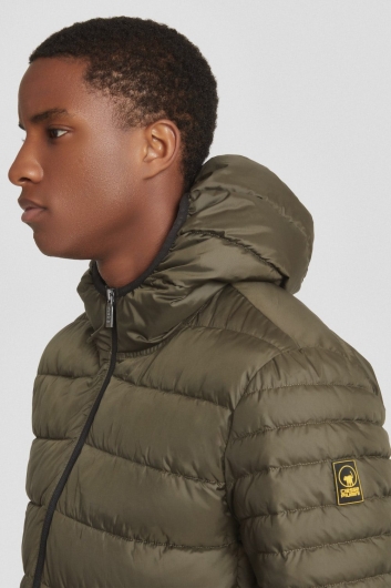 Piumino trapuntato con cappuccio fisso e materiali riciclati per un approccio sostenibile.