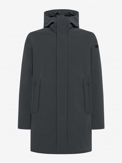 L'intramontabile design eskimo si trasforma in un capospalla prezioso, hi-tech e minimalista, che garantisce un alto livello di protezione dal freddo e dalle intemperie. Il modello leggero e confortevole è dotato di cappuccio fisso imbottito e presenta la costruzione in tessuto a membrana Stratofabric#3, impermeabile e traspirante. Il look super opaco dell'esterno nell'esclusivo tessuto stretch SURFLEX® esalta la nitidezza del design. La patta a bottoni metallici nasconde la chiusura a zip con doppio cursore, affiancata dalle pratiche tasche laterali a pistagna e zip invisibile. Il calore è assicurato dalla morbida e leggera imbottitura in piuma d'anatra 90/10, contenuta nei canali tubici che prevengono la fuoriuscita di materiale. L'interno presenta due tasche interne. Il logo a microiniezione nero sulla manica sinistra firma il capospalla con una nota iconica.