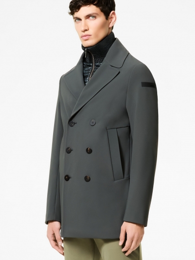 Il caban di lunghezza media, evoluto dall'amatissimo must-have del guardaroba maschile di stagione, è proposto nel tessuto a membrana Stratofabric #3 impermeabile e traspirante. Il look super opaco dello shell in esclusivo SURFLEX®, elegante e liscio al tatto, e la costruzione a termonastrature selettive interne aggiungono robustezza e un tocco di contemporaneità a un capo dall'eleganza sobria e senza tempo, ispirata dalla tradizione marinière. Nelle giornate autunnali più fredde e ventose, il capospalla offre la protezione del davantino in nylon imbottito e staccabile a mezzo zip, con il collo dolcevita arricciato a punto smock. La pregiata abbottonatura in corno chiude il doppio petto dagli ampi revers, con le tipiche tasche laterali a pistagna. Lo spacco posteriore aggiunge la massima libertà di movimento alla vestibilità regolare. L'interno presenta la fodera in caldo e pregevole velluto nero, ravvivata dal taschino interno a zip con filetti arancione e dalla tag a cuore "Made with love, designed in Tuscany". Il logo a microiniezione nero sulla manica sinistra completa questo capo continuativo di grande successo della Collezione.