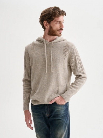 Maglia con cappuccio e coulisse. Realizzata in soft Shetland con i tipici colori Chateclaire. Caratterizzata da una lavorazione originale con coste irregolari. Fondo e polsi a coste.